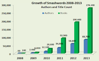 Le bilan. Le graphique ci-dessous se passe de commentaires : la progression par rapport à 2012 en nombre de titres publiés est d’environ 86 000 (+ 45 %), en partie grâce à l’arrivée de 25 000 nouveaux auteurs (+ 42 %). Sur ce point, je voudrais attirer l’attention des auteurs francophones sur l’intérêt pour eux de Smashwords, qui me semble négligé. Smashwords est une plateforme d’autopublication gratuite semblable à Amazon, mais également un distributeur qui vous permet de vendre vos livres automatiquement sur Apple, Kobo, Fnac, Sony, Diesel et d’autres librairies en ligne. C’est un plus. Dans les catégories romance, fantasy, erotica (celles qui marchent le mieux dans la galaxie des ebooks), plusieurs titres de Smashwords se sont retrouvés dans diverses listes de best sellers américaines l’année dernière. Commentaire de Mark Coker : « C’est là un nouvel ordre du monde où le pouvoir de publier passe des bureaux des éditeurs traditionnels dans les mains des auteurs. »